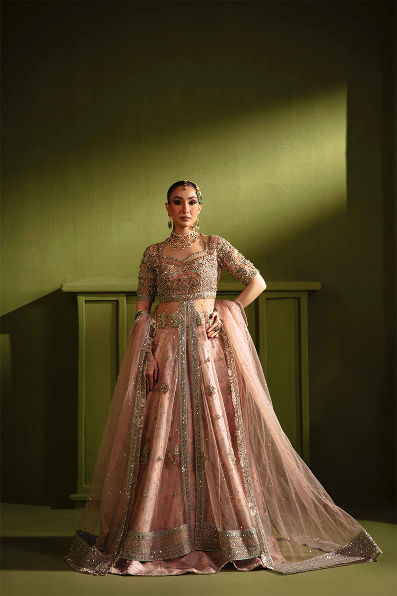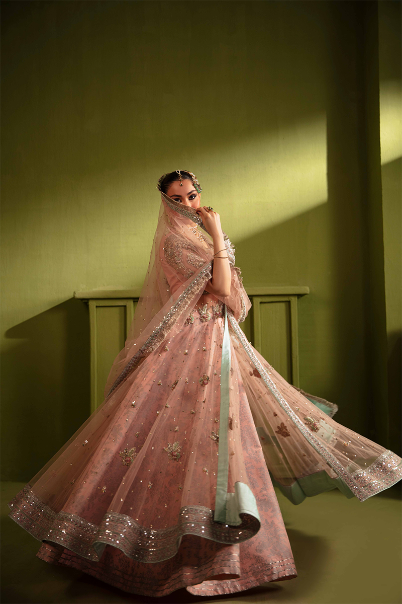 A vision of timeless romance, this ensemble is designed for the modern woman who adores tradition with a contemporary touch. The soft rose-pink net peshwaz is heavily adorned with heavy handwork of Cutdana, Dabka and different shades of sequences on the bodice, sleeves, and all over front and back, shimmering with intricate artistry. It is paired with a screen-print lehnga enhanced with delicate gota work, while the embroidered net dupatta is finished with kiran edging, a graceful spray of hand embellishments, and embroidered boarders. Every detail speaks of elegance, making this masterpiece a true celebration of beauty and refined charm.